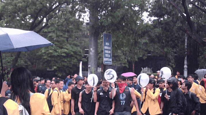 Mahasiswa melakukan aksi teatrikal menggunakan balon angka di tengah cuaca hujan. (Sumber foto: Winda Purnamasari) Aksi damai digelar di depan Markas Kepolisian Daerah