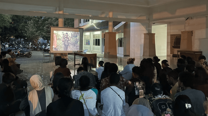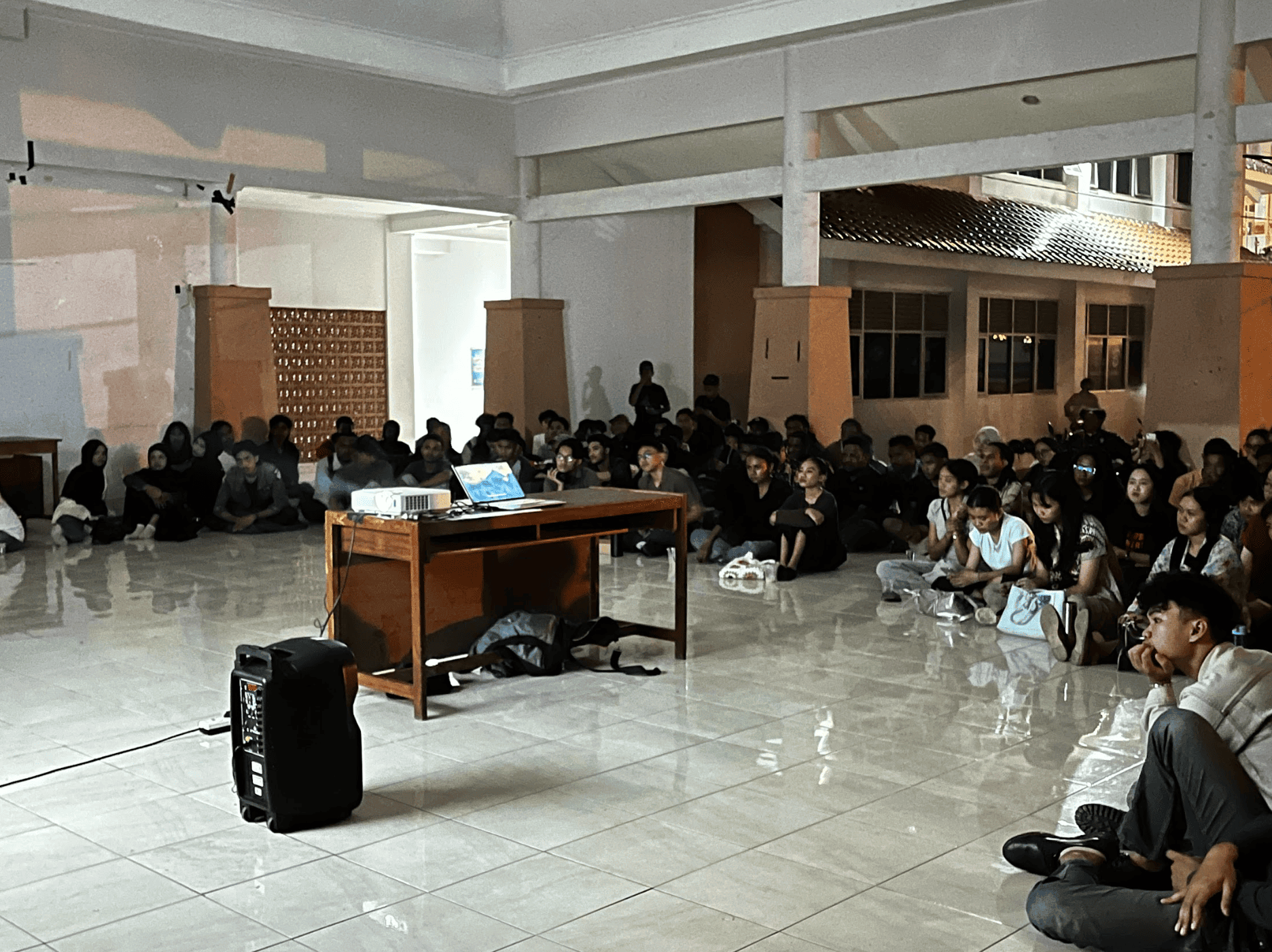 Sejumlah mahasiswa tampak fokus menyaksikan penayangan film “Pesta Babi” (Sumber Foto: Media dan Informasi BEM Undip)